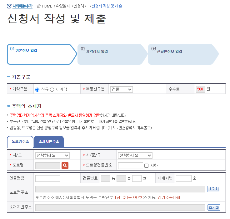 만약 전세를 재계약 하셨다면 재계약을 체크하시고 신규라면 신규에 체크하시고 아래 이사갈 주소를 적어 주세요. 확정일자는 수수료 500원이 필요 합니다.