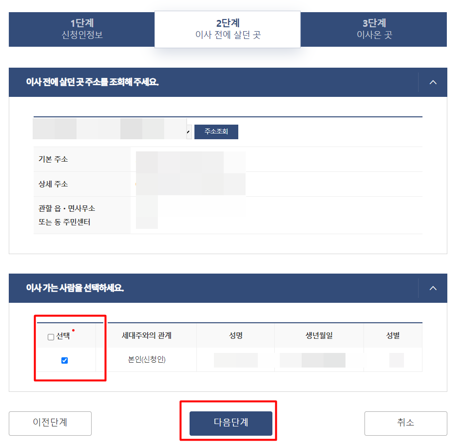 이제 2~3단계만 남았는데요. 2단계에서는 아래와 같이 이사 전에 살던 주소가 나옵니다. 맞나 체크하시고 맞다면 아래 체크하시고 다음단계를 눌러 주세요.