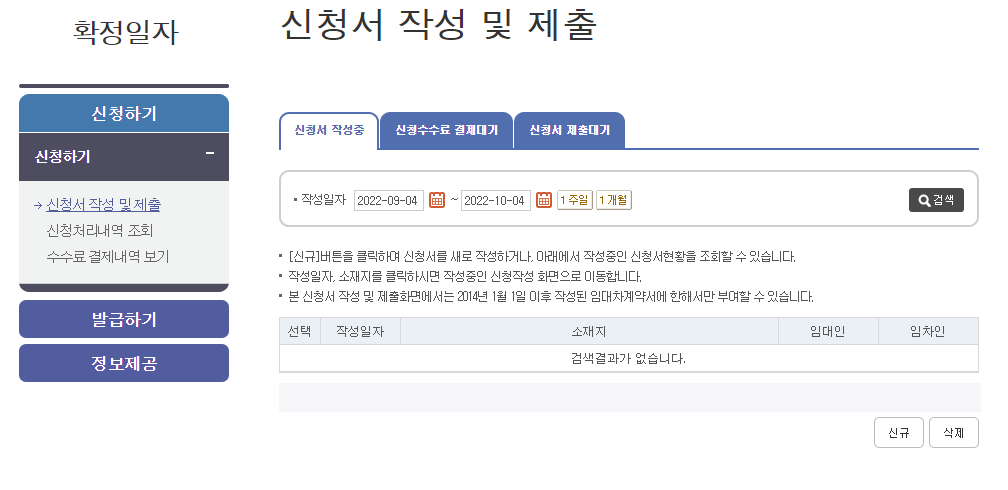 회원 가입 후 확정일자 카테고리에 마우스를 올려두시고요. 신청하기에 신청서 작성 및 제출을 눌러주세요.