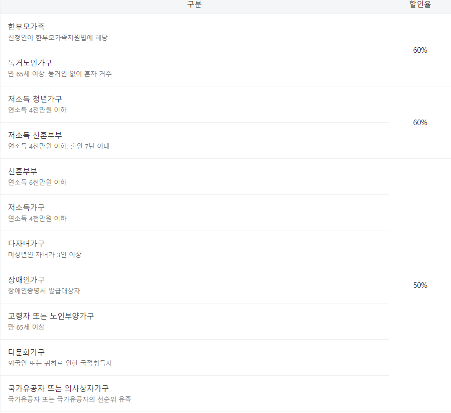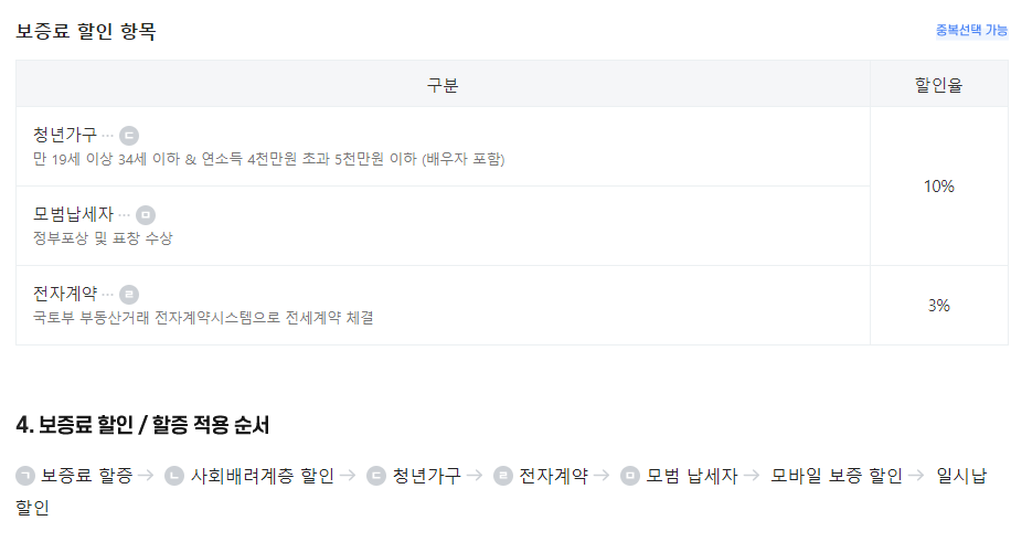 전세금 반환 보증보험은 사회배려계층에게 추가할인이 되는데요. 한부모가족, 독거노인가구, 저소득 청년가구, 저소득 신혼부부(연소득 4천이하), 신혼부부(연소득 7천이하), 저소득가구(4천이하), 다자녀가구, 장애인가구, 고령자 또는 노인부양가구, 다문화가구, 국가유공자 또는 의사상자가구 입니다. 최대 60%까지 할인이 되니 반드시 할인되는지 여부를 체크하셔야 합니다.