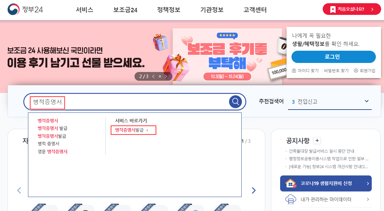 정부24로 이동하신 후 먼저 검색창에 병적증명서라고 검색을 하세요. 그럼 바로가기가 나올 겁니다. 바로가기를 눌러 주세요.