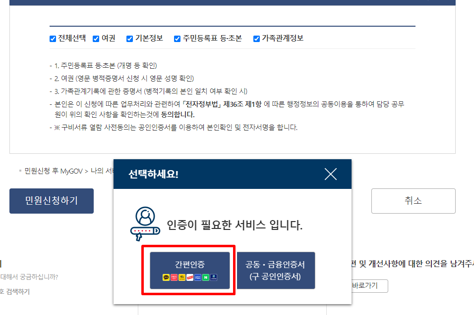 그럼 인증을 하라고 나올텐데요. 모두들 스마트폰이 있으시고 카카오톡이 있으실테니 간편인증을 통해 카카오톡 인증을 해주세요. 보다 더 편한 방법이 있다면 그 방법으로 발급신청을 해주시면 됩니다.