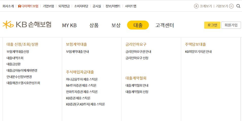 KB손해보험의 경우 먼저 회원가입을 해야 합니다. 때문에 회원가입을 하시고 보험계약대출을 진행 해주셔야 합니다. 아래처럼 회원가입 후 로그인을 하시고 그다음 보험약관대출을 신청 해 주세요.