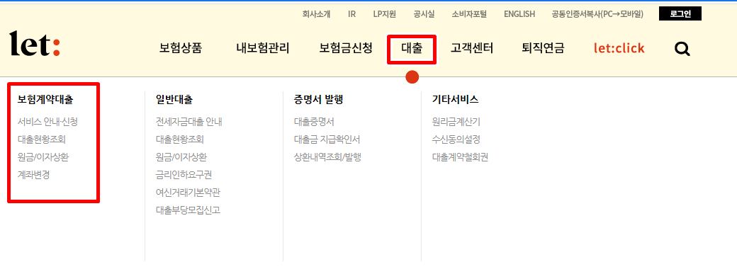 롯데손해보험 홈페이지에 접속하신 후 아래 그림처럼 대출 카테고리에서 좌측의 보험계약대출을 눌러 주세요. 빨간 박스 체크해둔곳을 보시면 됩니다. 보험계약대출에서는 서비스안내 신청을 눌러 주세요.