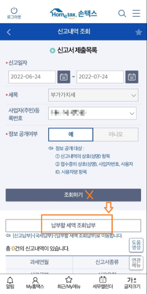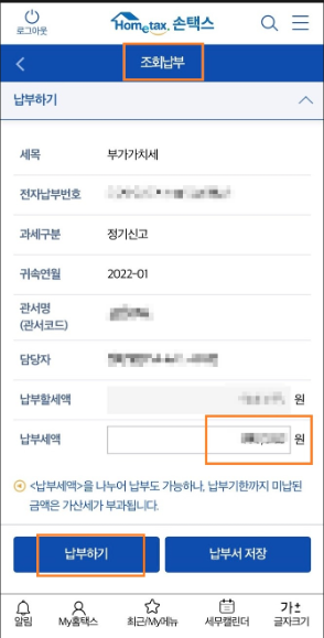 2. 부가세 손택스 어플로 카드납부 또는 현금납부 하는 방법 순서