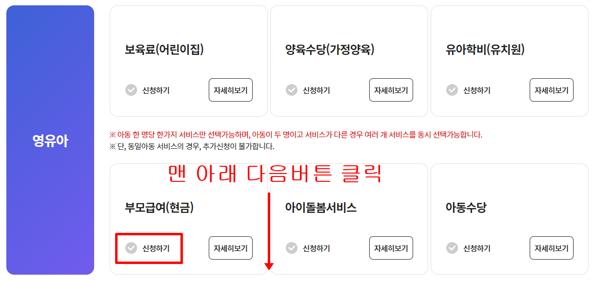 부모 급여 신청 바로가기(지원대상/신청방법/지원금액)