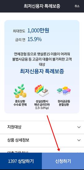 앱을 다운로드 하면 메인화면에 최저신용자특례보증이 있는데요. 여길 눌러 주시고 아래 신청하기를 눌러 주시면 됩니다. 회원가입은 필수 이니 참고해 주세요.
