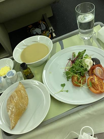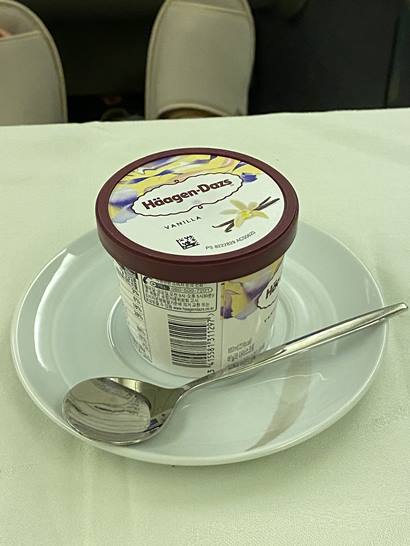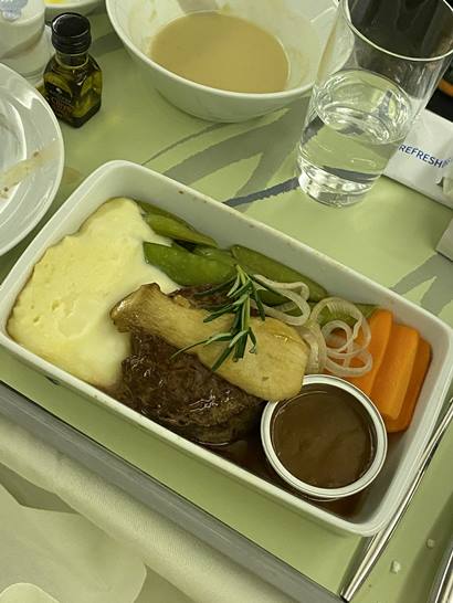 식사전 좌측그림의 간식을 먼저 줍니다. 그리고 식사가 나오는데요. 식사가 뒤죽박죽이네요. 우측사진은 아침식사구요. 아래 스테이크는 저녁식사 입니다. 후식으로 하겐다즈 아이스크림이 나옵니다.
