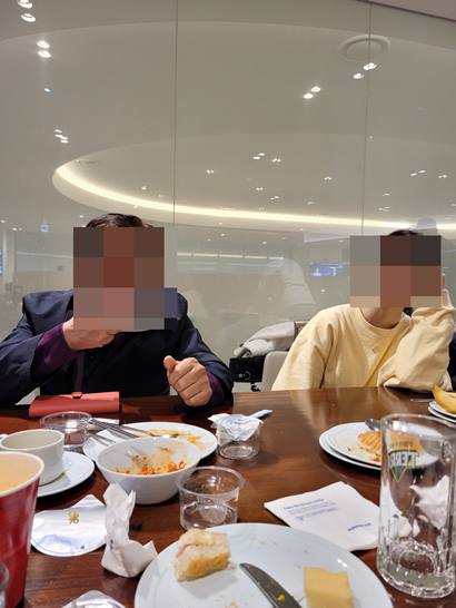 라운지에는 다양한 음식이 뷔페식으로 준비되어 있습니다. 위스키, 와인, 라면, 과자, 빵, 견과류, 각종 과일, 커피등이 준비되어 있습니다. 물론 무료 입니다.