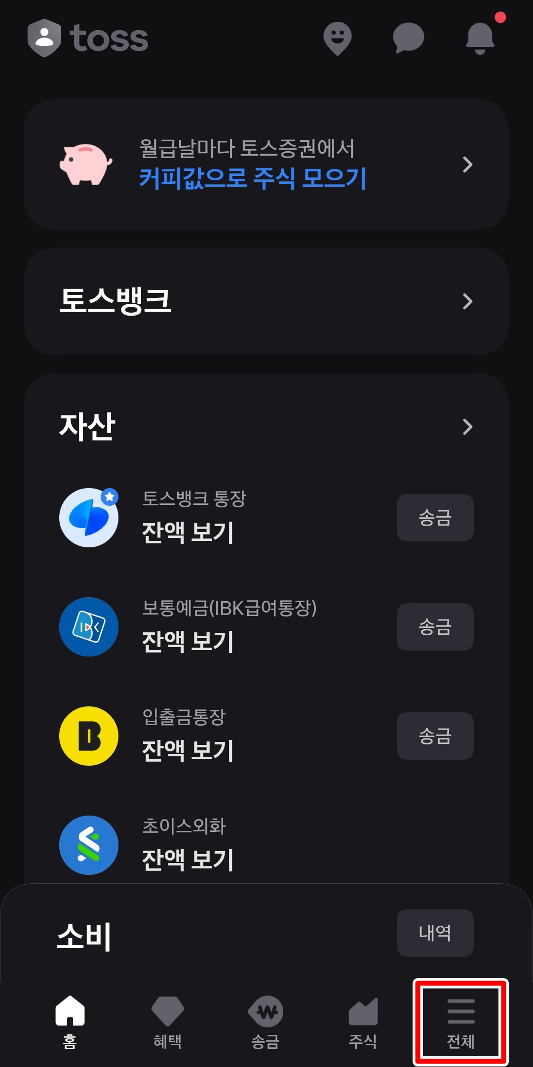 먼저 아래 그림처럼 토스뱅크 앱을 설치하신 뒤 간단한 인증을 하시고 우측밑의 전체로 들어가 주세요. 그럼 우측 그림처럼 내 신용점수라는 카테고리가 있을텐데요. 내 신용점수로 들어 가 주세요.