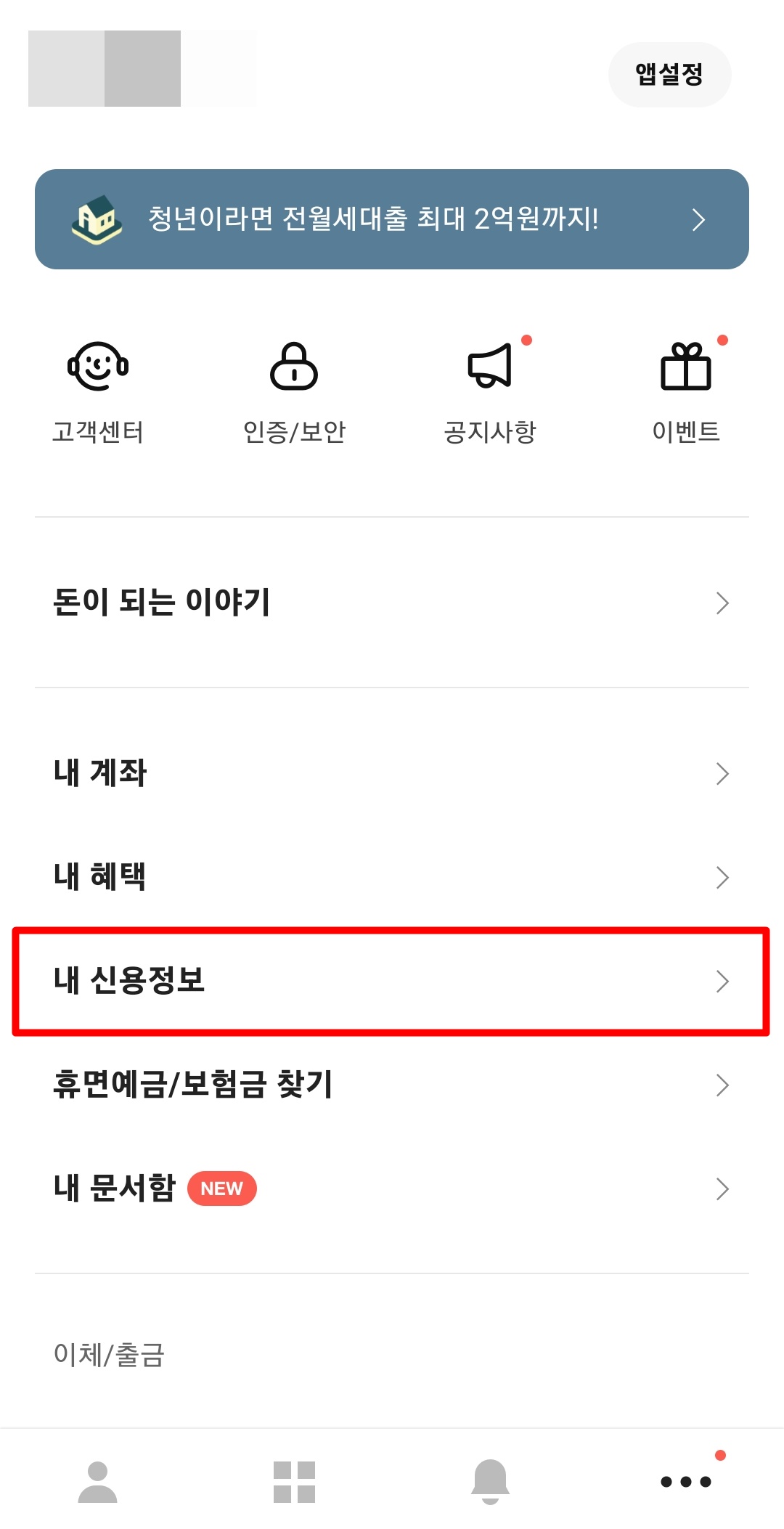 다운로드 후 앱으로 들어가서 아래 그림처럼 우측하단의 점 세개모양을 눌러 주세요. 편의상 사진을 두장씩 올리면서 설명 드리겠습니다. 우측 점세개 모양을 누르고 들어가셔서 세번째의 '내 신용정보' 를 눌러 주세요.