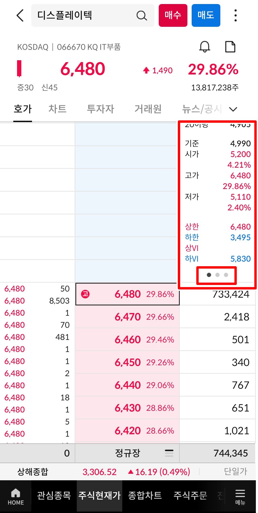 저는 예를 들기 위하여 디스플레이텍이란 종목의 신용비율을 확인 해볼께요. 위와 같은 화면이 나올텐데요. 호가창 우측을 보시면, 제가 빨간 테두리를 쳐둔 작은 창이 있고요. 3페이지로 나뉘어 있는 것을 보실 수 있습니다. 이 화면만을 좌측 또는 우측으로 넘겨 보세요. 즉 이 창에서 손가락을 넘기시는 거에요.