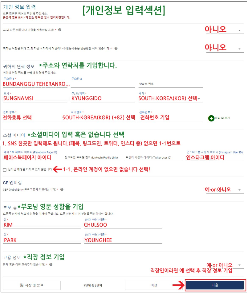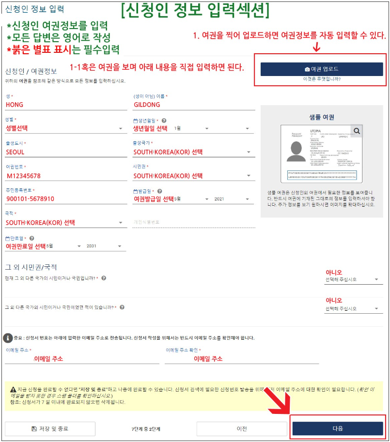 여권을 찍어서 업로드 하면 자동으로 정보가 불러와 지는데요. 그래도 올바르게 입력 됐는지 다시한번 체크해 주세요. 그래도 웬만하면 직접 작성하는게 좋습니다. 작성을 끝내셨다면 아래 다음 버튼을 눌러 주세요.