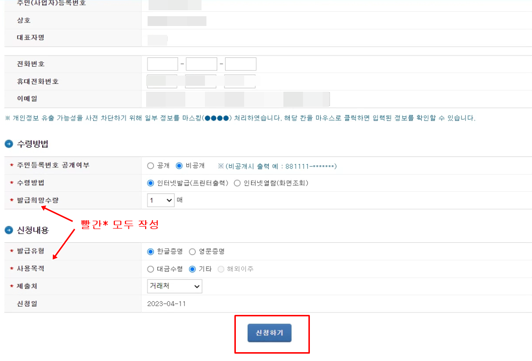 납세증명서(국세완납증명)에 들어가시면 아래 그림과 같이 내 사업자번호(주민번호)가 맞는지, 상호명은 맞는지를 체크하신 후 맞다면 전화번호와 이메일을 입력해 주시구요.