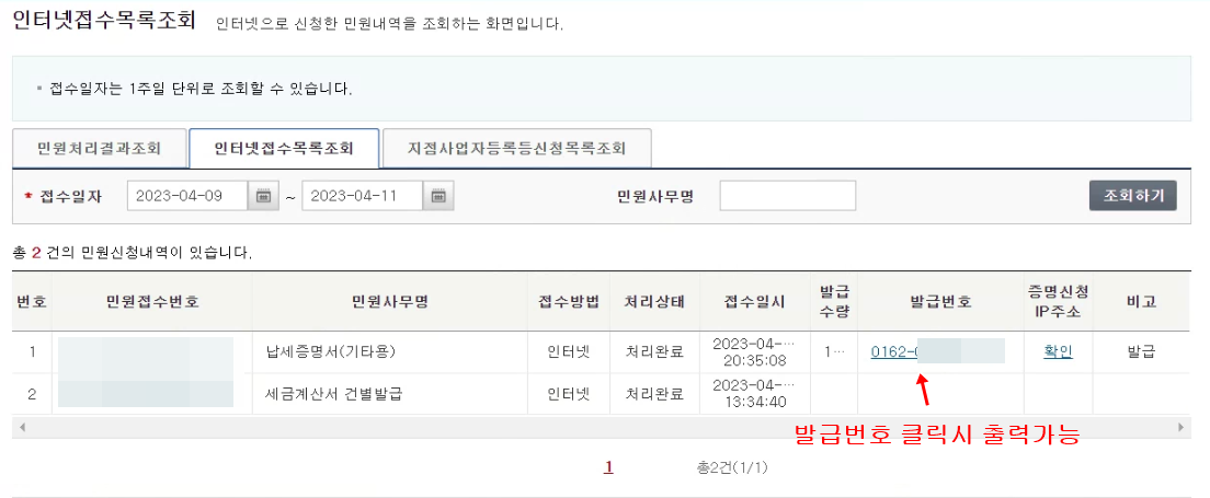 정보를 입력한 후 신청하기를 눌렀다면 접수조회목록으로 넘어가게 되는데요. 처리가 완료되면 우측 비고란에 발급이라고 표시되고(발급표시되면 국세완납증명서 발급가능상태), 발급번호를 클릭하시면 미리보기 화면이 팝업으로 뜹니다.