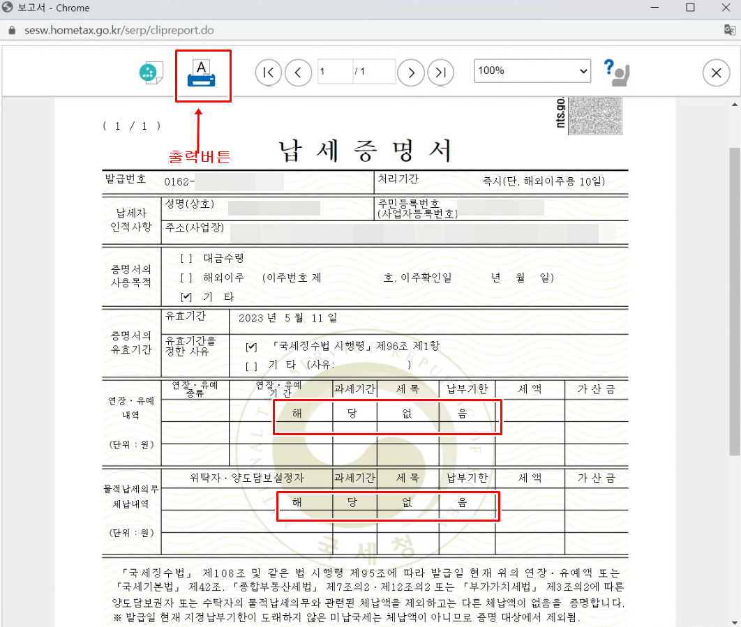 납세증명서의 연장, 유예부분과 물적납세의무 체납내역에 해당없음으로 표기가 되면 나의 국세가 모두 완납됐음을 표시하는것입니다.