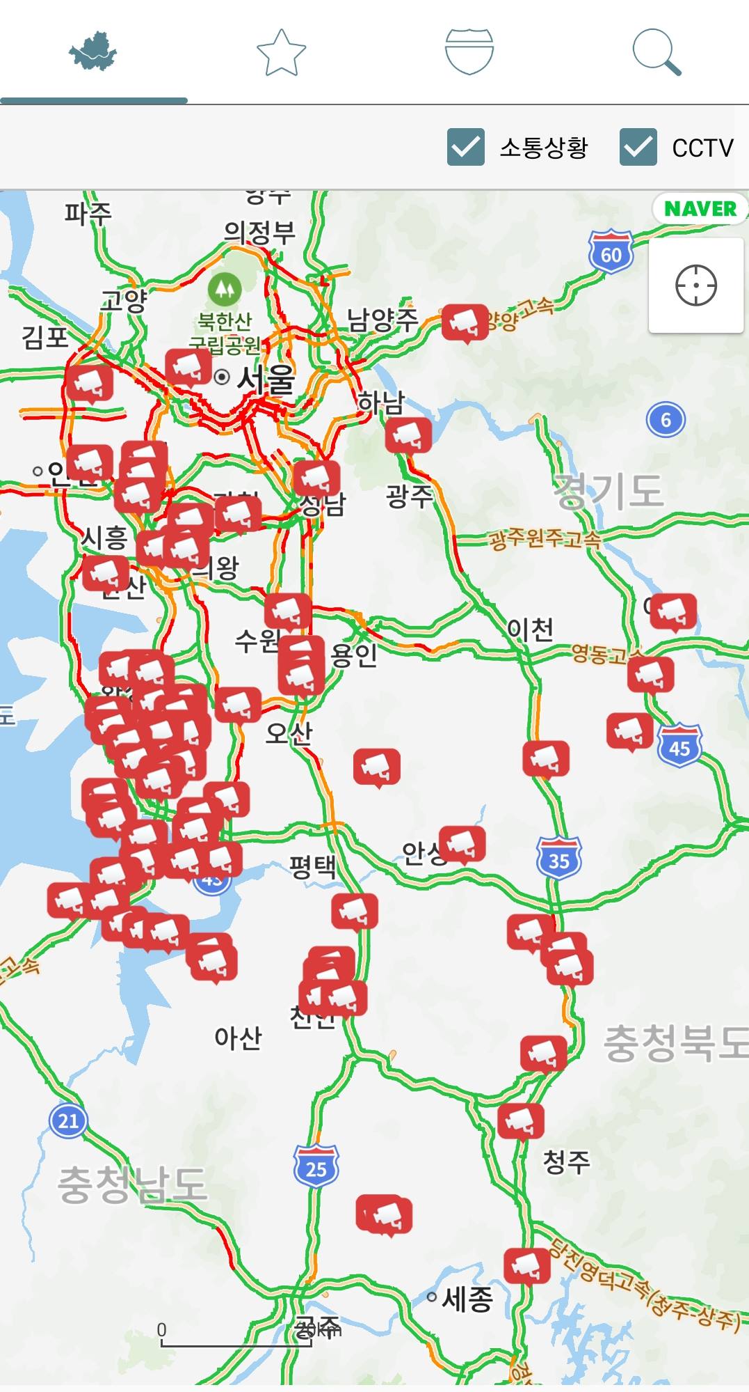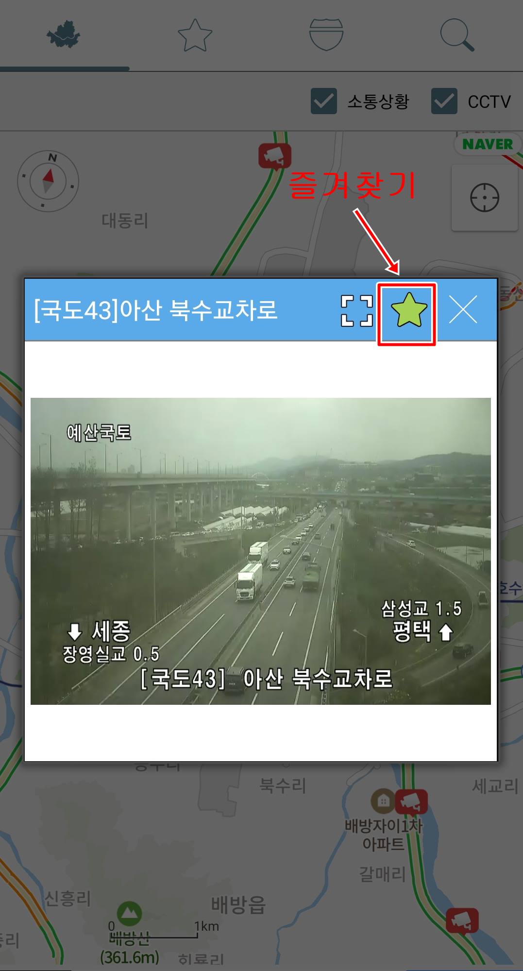 똑같이 메인화면을 들어가면 전국 교통지도가 펼쳐 집니다. 알고자 하시는곳을 확대 하신 후 CCTV를 찾아 주세요. 예를 들기 위해 아까 PC버전에서 처럼 43번국도 아산부근을 찾아 보겠습니다. 그럼 팝업창이 뜨면서 실시간 국도 교통정보와 CCTV가 나오는데요. 여기서 별표를 누르게 되면 즐겨찾기가 되기 때문에, 자주 이용하시는 곳의 CCTV라면 이렇게 즐겨찾기를 해두시면 좋습니다.