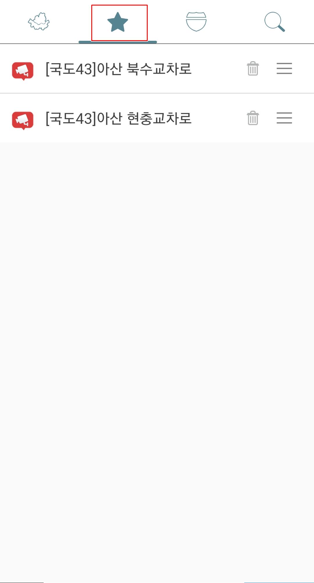 그리고 상단에 보시면 별표 모양이 있는데요. 여기를 누르시면 내가 즐겨찾기 해둔곳의 CCTV가 모아져 있습니다. 때문에 자주 이용하시는 도로가 있다면 CCTV를 이곳에서 관리하시면 됩니다.