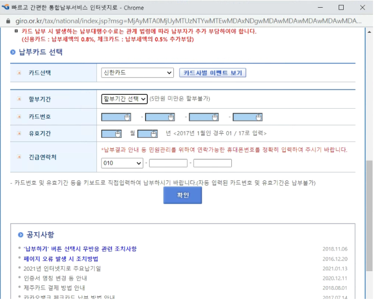 그다음 신용카드번호와 유효기간을 입력 후 아래 확인버튼을 눌러 납부해 주세요.
