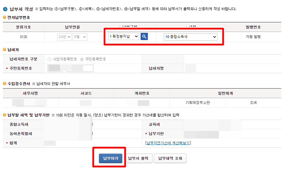 그럼 내 관할 세무서와 아래 종합소득세 금액이 뜨게 되는데요. 맞게 표기 됐는지 확인 후 아래 납부하기 버튼을 눌러 주세요.