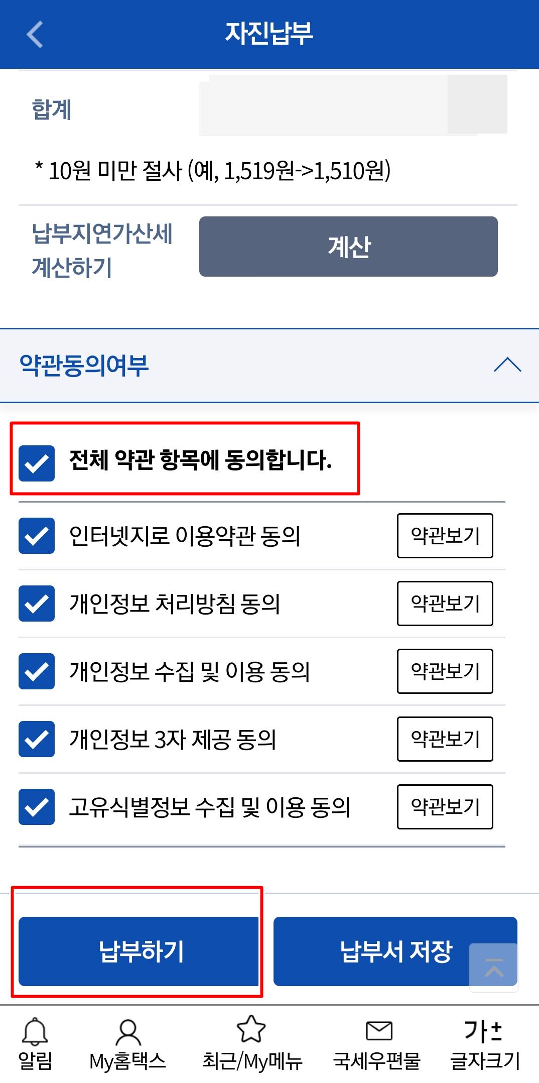그리고 아래 그림처럼 약관에 모두 동의를 체크해 주시구요. 납부하기를 눌러 주세요. 납부하기를 누르면 모바일 지로 앱이 자동으로 켜지게 되고요. 거기서 납부를 완료해 주시면 됩니다.