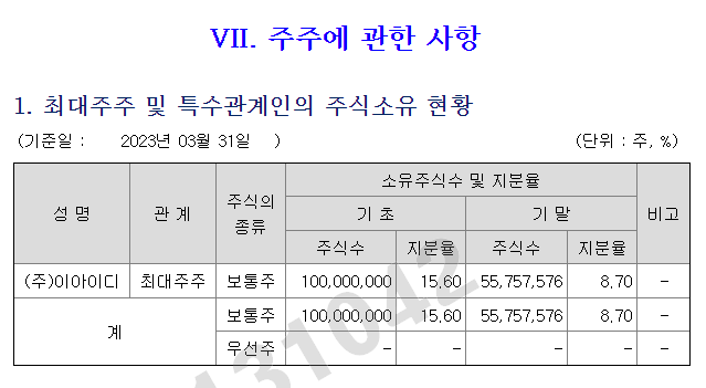 총 5575만주를 가지고 있어 이아이디가 최대 주주인데요. 지분율은 8.7%로 높은 편은 아닙니다. 그럼 이아이디의 최대주주는 누구일까요? 바로 2929만주를 가지고 있는 이화전기입니다.