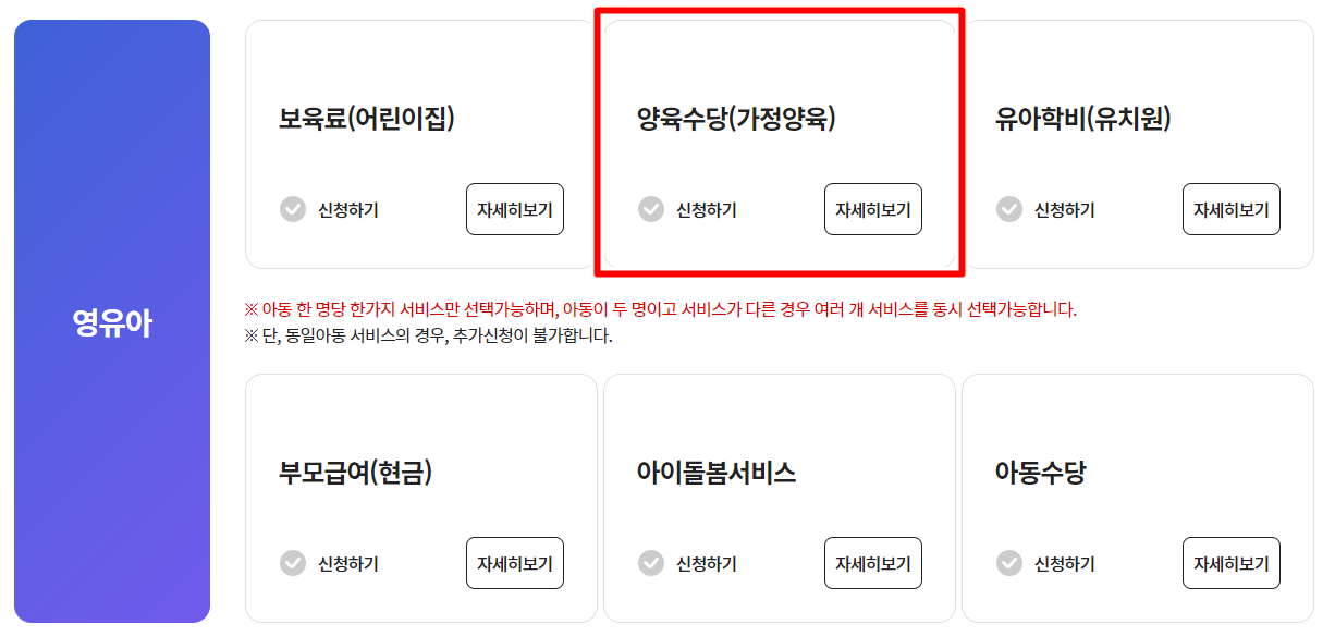 먼저 복지로 사이트로 이동하신 후 홈화면에서 서비스 신청 메뉴를 찾아서 클릭해 주세요. 그럼 여러가지 서비스들이 나오는데, 두번째에 영유아 메뉴에 있는 양육수당(가정양육)을 찾아서 신청하기 버튼을 눌러 주세요.