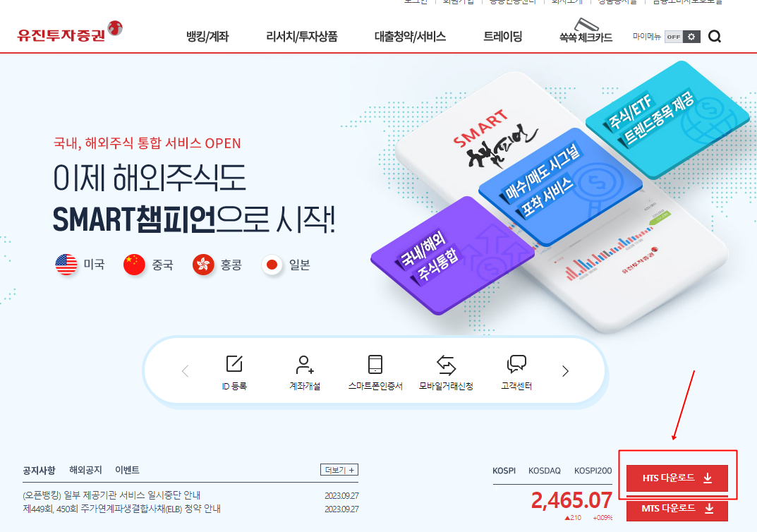 홈페이지로 가셔서 아래로 살짝 내리시면 HTS 다운로드 링크가 보이실 겁니다. 아래 그림을 참고해 주세요.