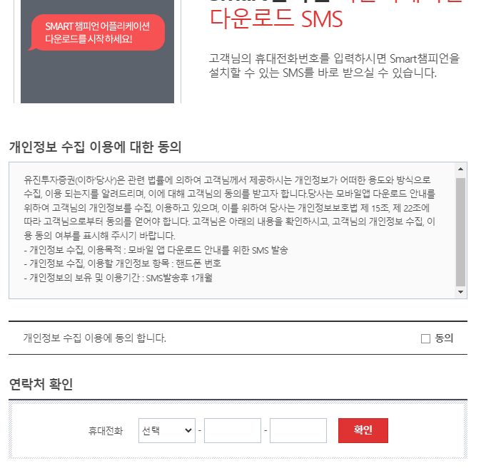 유진투자증권 스마트폰 거래시스템인 MTS는 앱스토어에서 검색하셔도 되지만, 홈페이지에서 휴대폰 번호를 입력하면 다운로드 링크를 즉시 보내 줍니다. 아까 메인화면에서 HTS다운로드 밑에 있는 MTS다운로드를 클릭해 주세요. 그럼 다음과 같은 화면이 나오는데요.