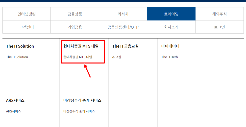 상단처럼 짝대기 3개를 누르셨다면 현대차증권 홈페이지의 다양한 메뉴가 나오는데요. 아래 그림처럼 트레이딩을 눌러주세요. 그럼 아래 H solution 이라는 HTS 다운로드 카테고리가 보이실겁니다. H solution을 눌러 주세요.