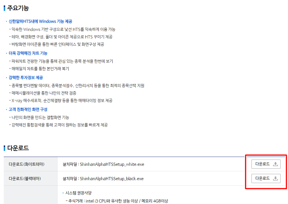 그럼 신한알파라고 해서 신한투자증권 HTS의 주요기능이 나오는데요. 더 내리시면 다운로드 단추가 있습니다. 화이트테마 또는 블랙테마를 선택하여 다운하실 수 있습니다.