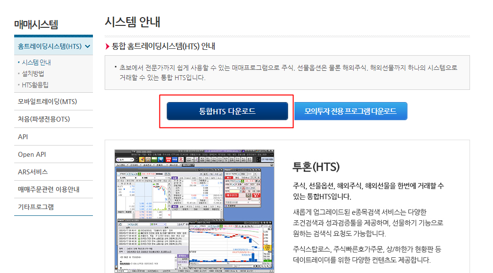 홈페이지 상단에 보면 다양한 카테고리가 있는데요. 고객센터-> 매매시스템을 눌러 주세요. 아래 그림처럼 따라하시면 됩니다. 매매시스템에 들어가시면 홈트레이딩시스템(HTS)가 보이실겁니다. 이걸 눌러 주세요.