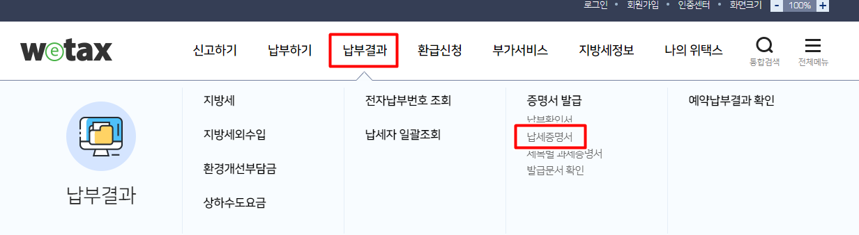 로그인을 하셨다면 상단의 카테고리중 납부 결과를 눌러 주시고, 증명서 발급 메뉴에서 납세 증명서를 클릭해 주세요. 아래 사진처럼 따라 오시면 됩니다.