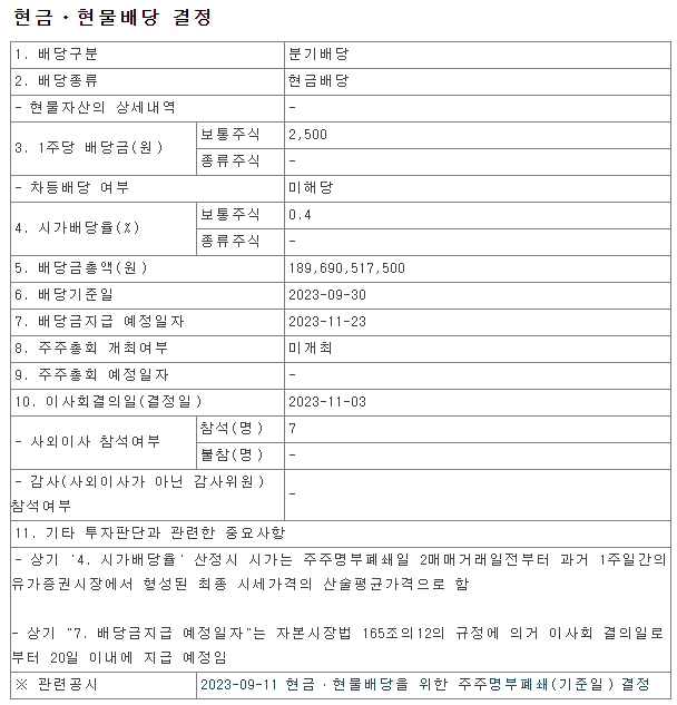 분기배당금의 경우 배당일을 공시해주기 때문에 포스코홀딩스 배당일을 쉽게 아실 수 있습니다.