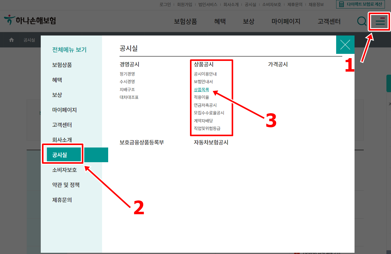 하나손해보험 홈페이지에서 약관을 찾는 방법 입니다. 먼저 홈페이지 메인화면에서 우측 상단에 짝대기3개 모양을 눌러 주세요. 그럼 목록이 활성화 되는데요. 좌측에 공시실을 눌러 주시고 우측 상품공시에서 상품목록을 눌러 주세요.