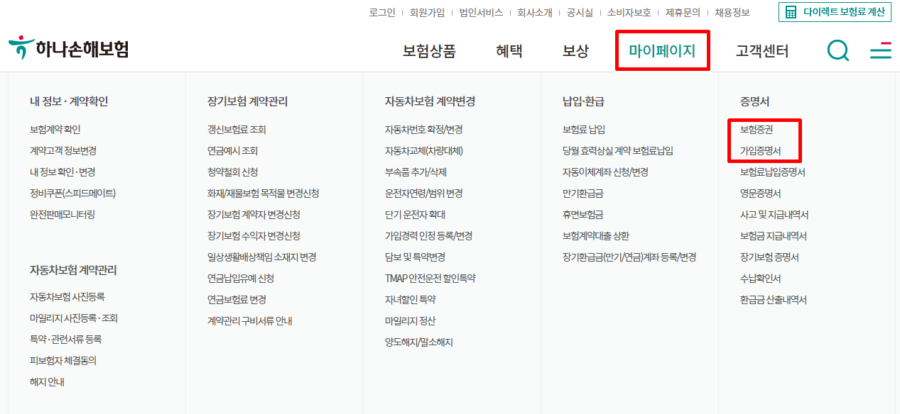 먼저 홈페이지로 이동하신 후 메인화면의 카테고리에서 마이페이지를 찾아 주세요. 마이페이지에서 증명서 메뉴에서 보험증권 및 가입증명서를 찾아 다운받아 주시면 됩니다. 아래 표를 참고 하세요.