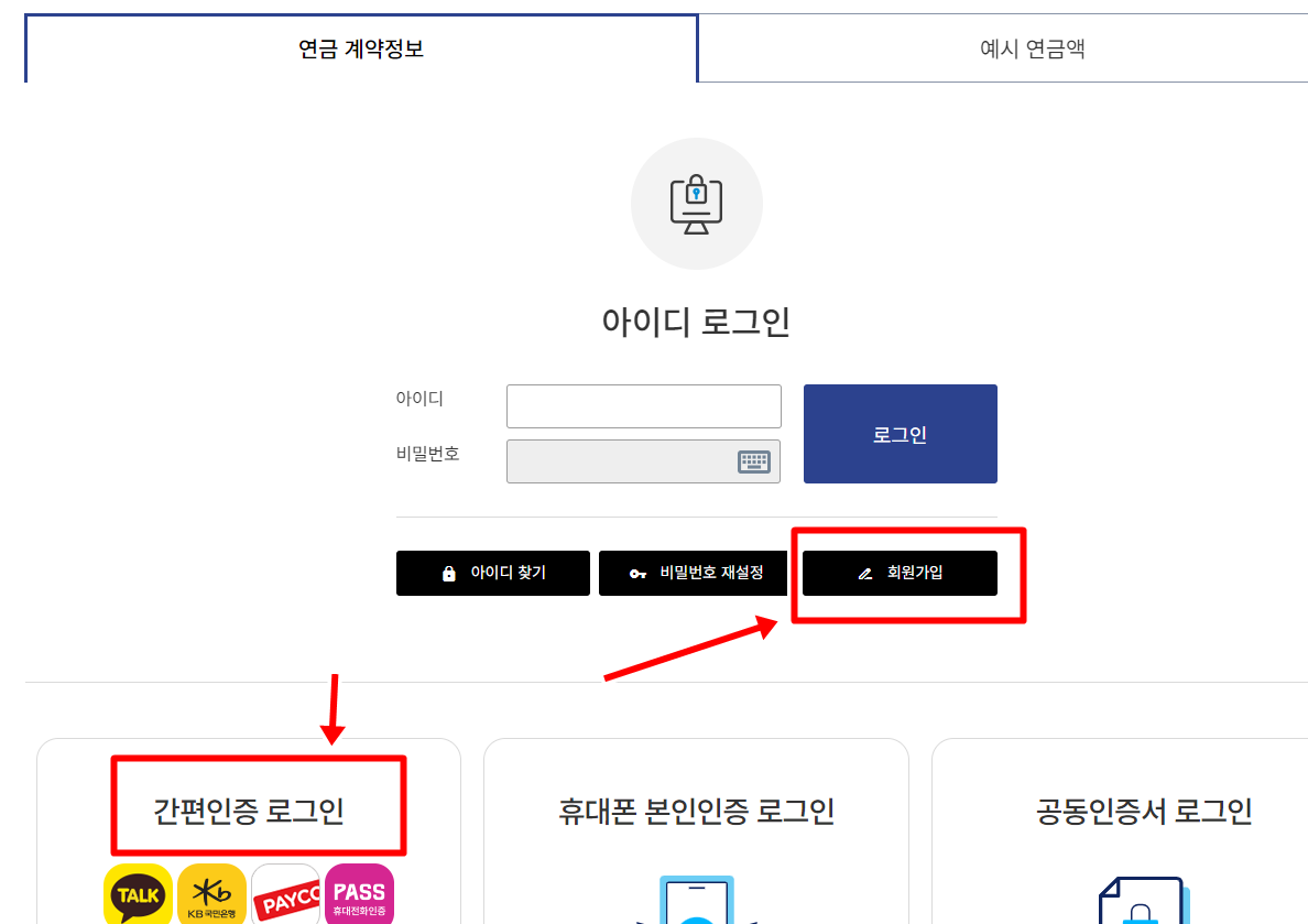 그다음 회원가입을 하시던지, 간편로그인을 통해 로그인을 해주세요. 내 정보가 확인되어야 내 연금조회가 가능 합니다.