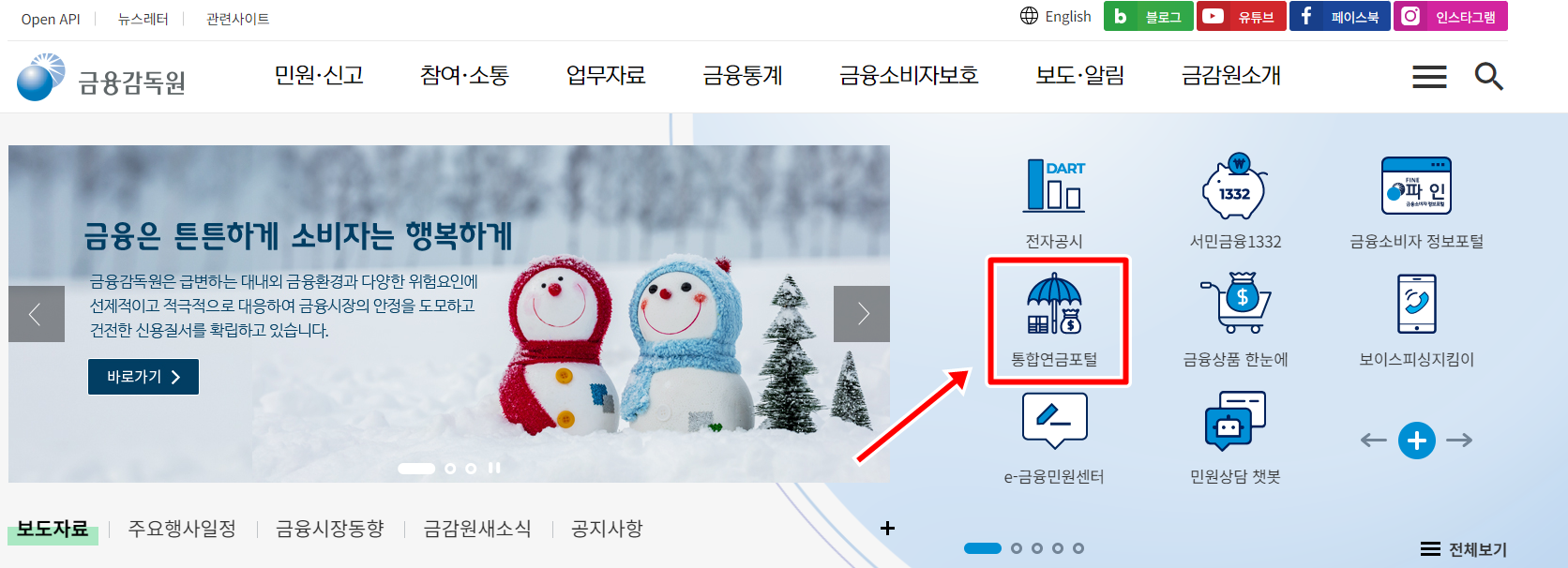 금융감독원 홈페이지로 접속하시면 아래와 같은 화면이 나오는데요. 우측에 통합연금포털을 클릭해 주세요.