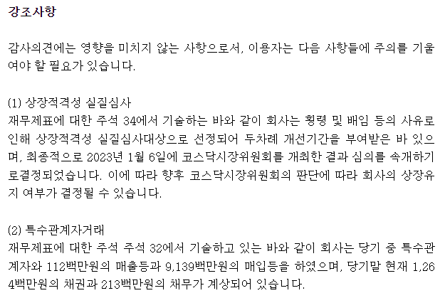 아이톡시는 가장 최근의 감사보고서(23년도 3월 제출)에서 외부 회계감사인이 다음과 같은 강조사항을 기술 하였습니다.