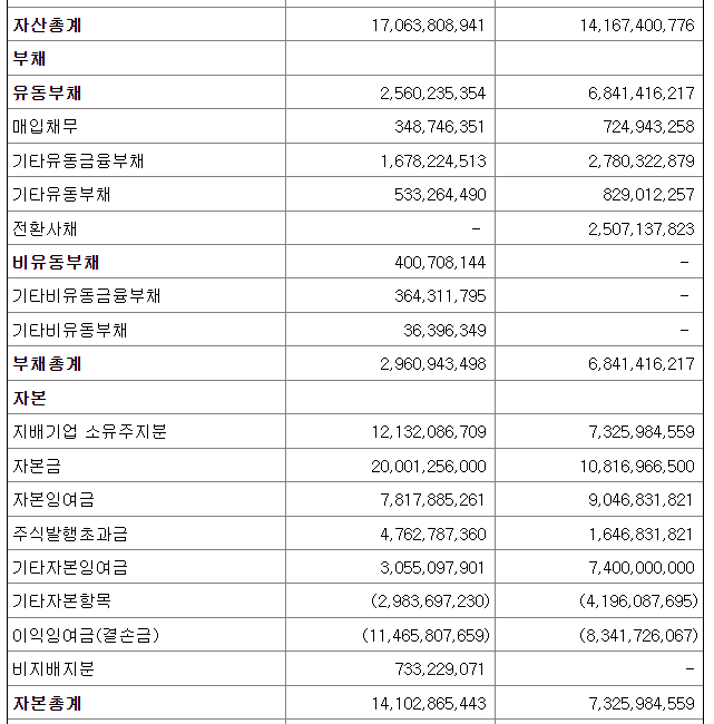 또한 결손금이 -110억원으로 누적된 상태이며 작년기준으로는 -32억의 적자를 보였습니다. 자본잠식을 빠르게 해소하고 누적결손금을 해치우기 위해서는 감자가 필요한 상태로 보여 집니다.