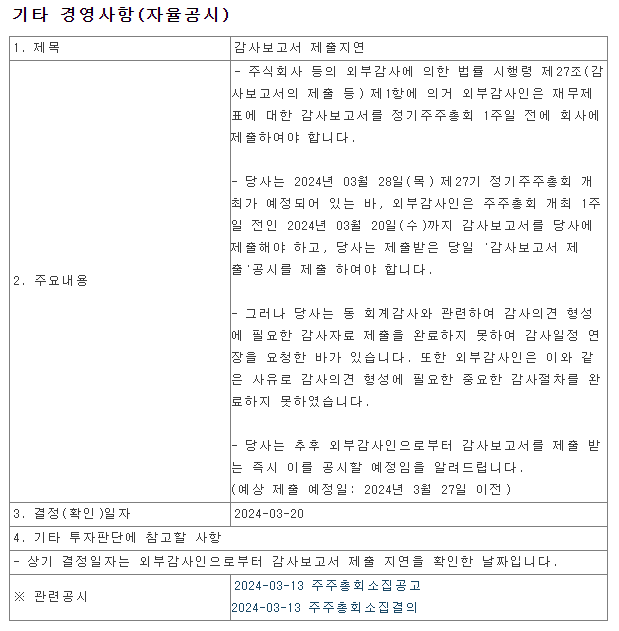 | 2024년 감사보고서 제출지연 기업 현황 List (0) | 2024.03.25 |