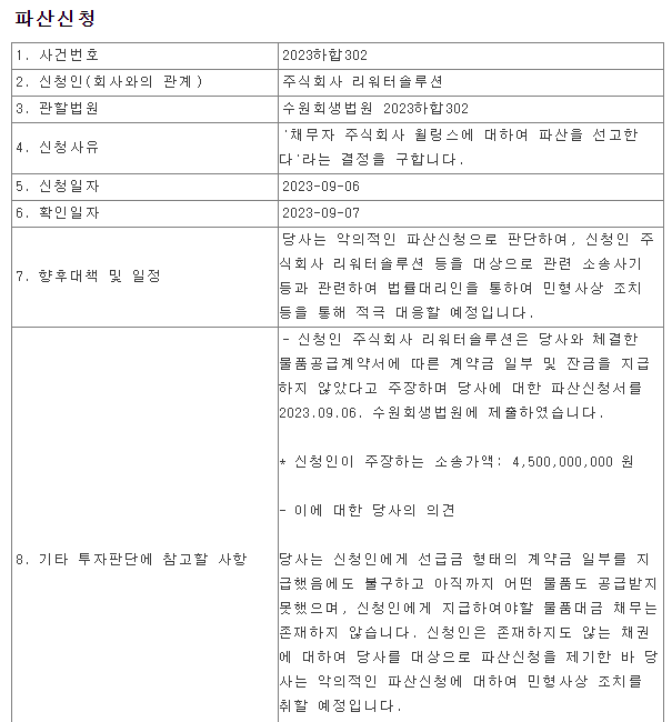 윌링스는 23년 9월 8일에 리워터솔루션이라는 회사에게 파산신청을 당하게 됩니다. 공시는 8일에 나왔으며 리워터솔루션이 법원에 파산신청을 한 날은 9월 6일 입니다.