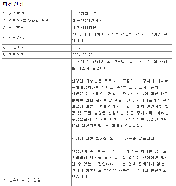 신청인 최승환씨가 당사의 채권을 가지고 있지도 않은데 파산신청을 했다고 하며 대응을 예고 하는 공시 입 니다. 이렇게 답변을 빠르게 하는게 보통 입니다. 왜냐하면 공시가 나오기전 이미 회사는 내용증명 또는 법원의 서류를 송달받은 상태이기 때문이죠.