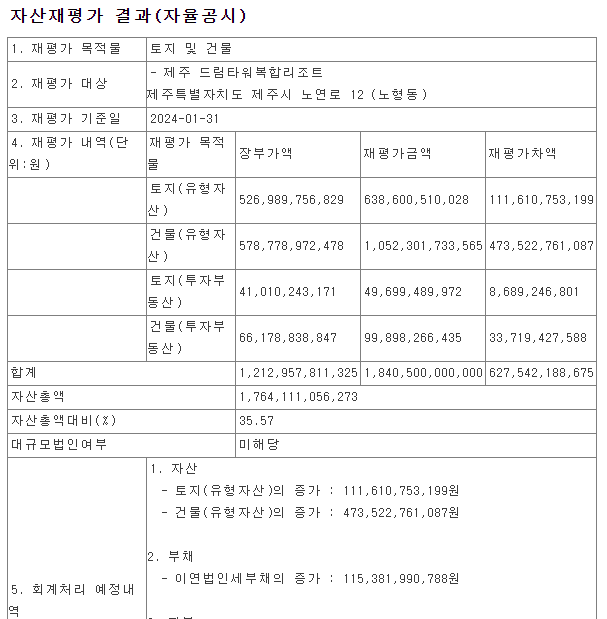 롯데관광개발도 최근 제주도에 있는 토지와 리조트건물에 대해 자산 재평가 공시를 한 바 있습니다.