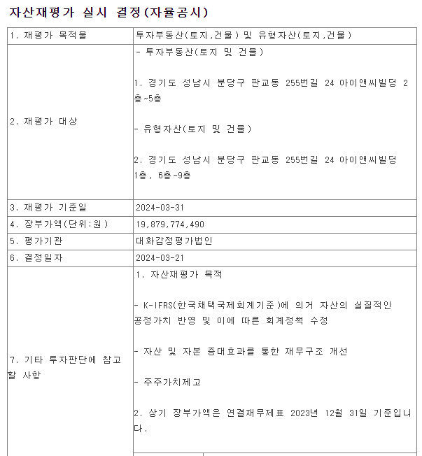 아이앤씨는 판교에 있는 자사 건물 및 토지에 대해 자산 재평가를 공시 한 바 있습니다. 이유는 자산 및 자본 증대효과를 통한 재무구조 개선, 주주가치제고라고 하고 있습니다.