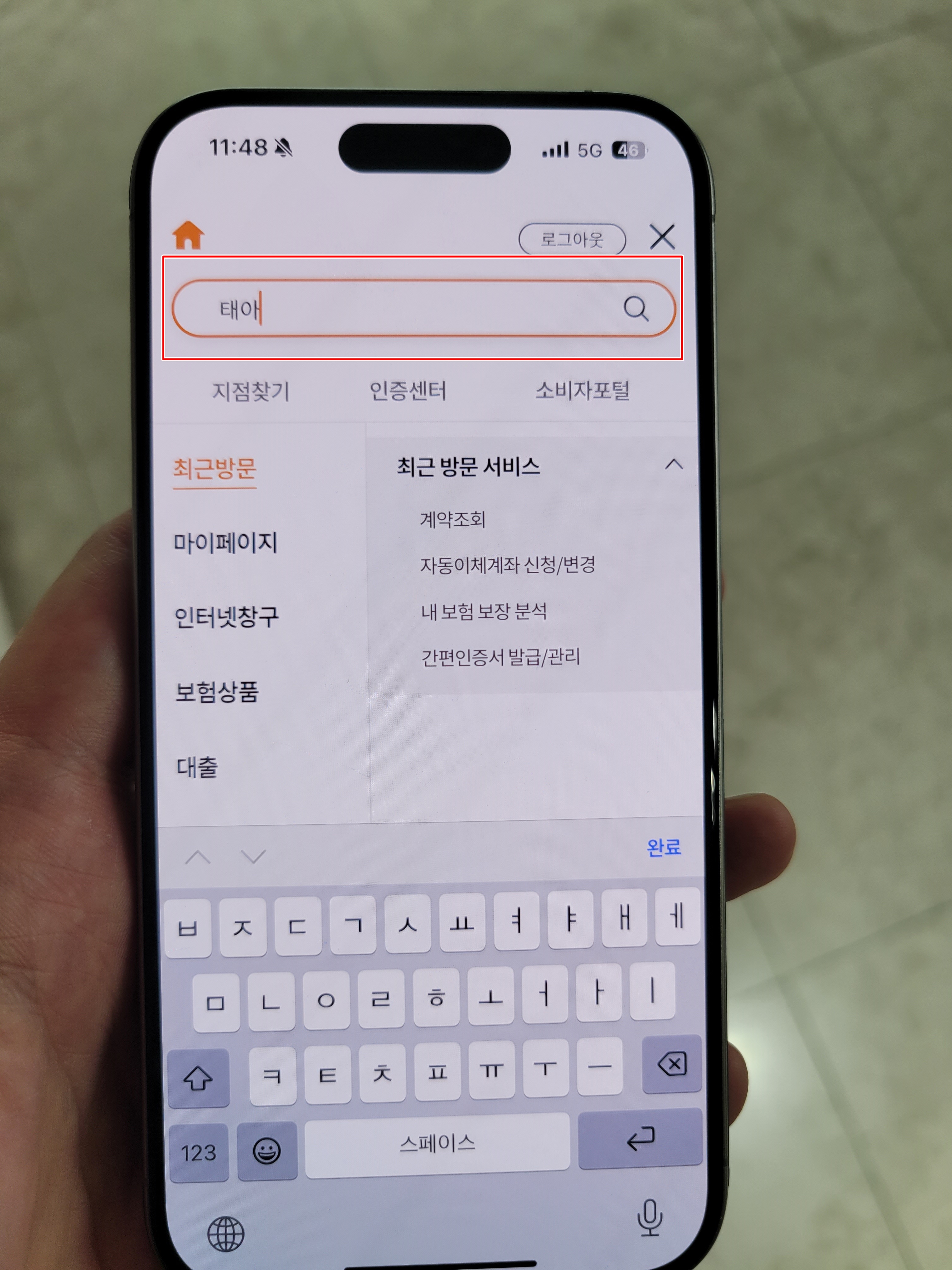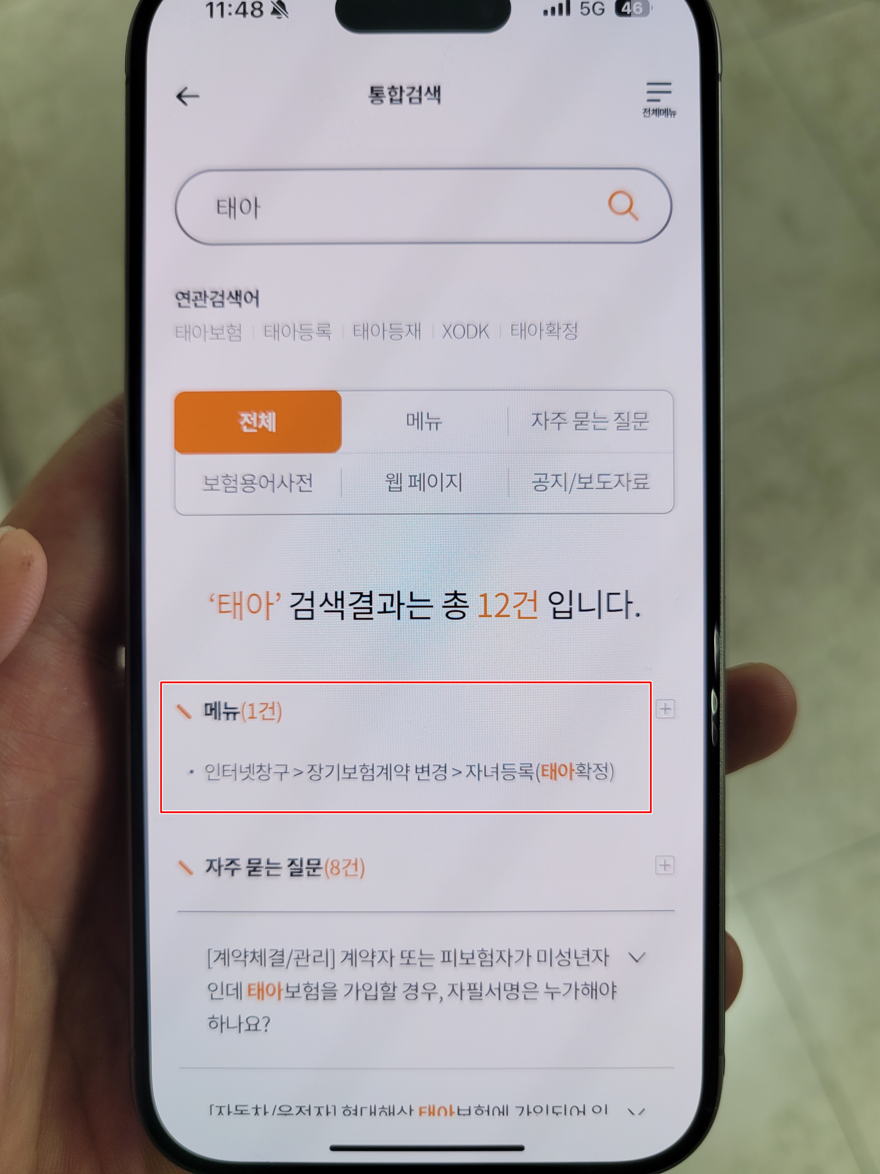 그다음 현대해상 앱을 열고 검색으로 들어가셔서 태아라고 칩니다. 그럼 위와 같은 메뉴가 나옵니다. 인터넷창구->장기보험계약 변경-> 자녀등록(태아확정) 으로도 가능 합니다만 검색이 빠르니 검색으로 하세요.