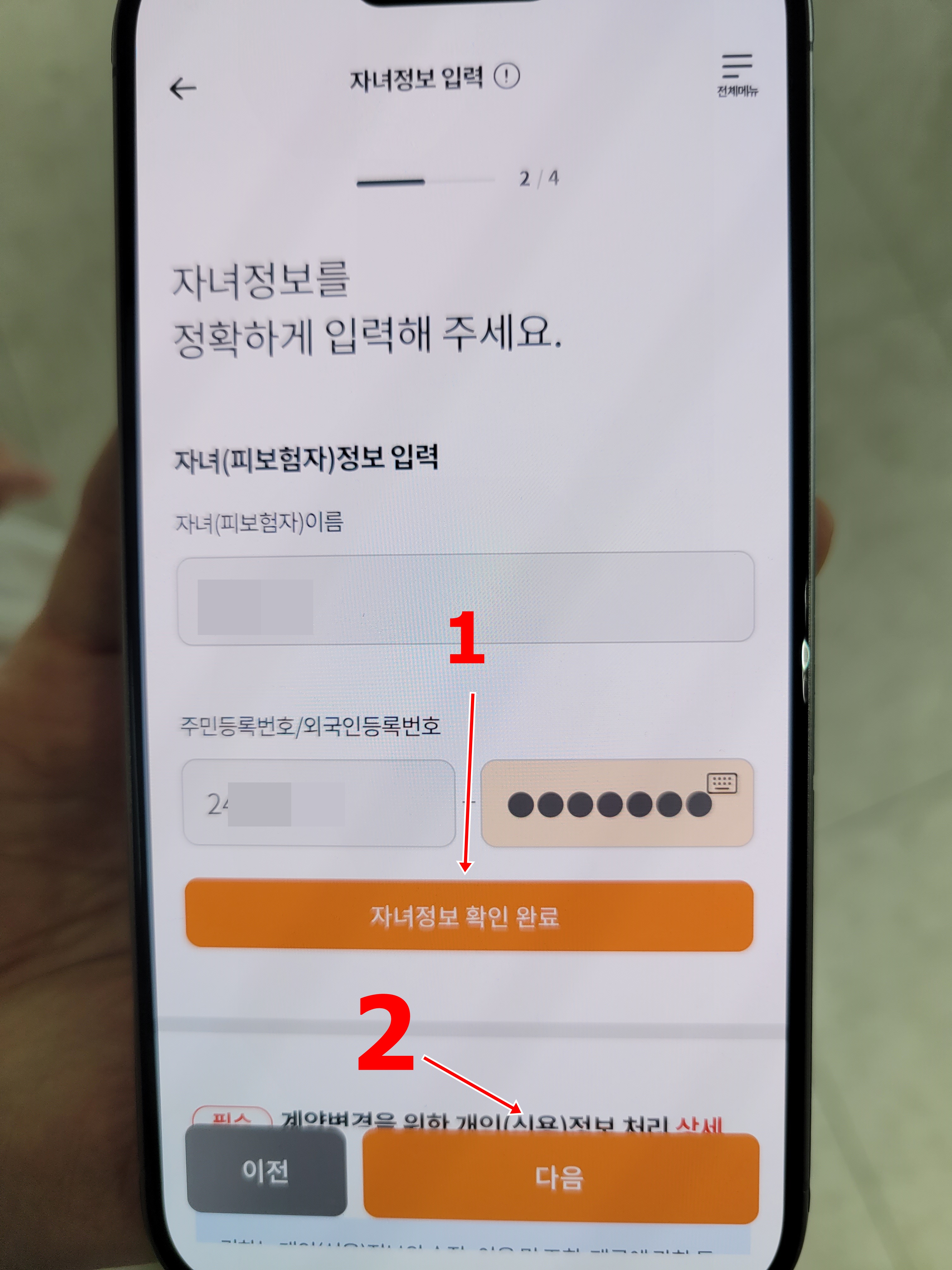 그다음 자녀의 주민등록번호와 이름을 넣고 자녀정보 확인 완료를 눌러서 인증을 해주세요. 참고로 출생신고를 하여 주민번호가 나와야 태아등재를 할 수 있습니다.