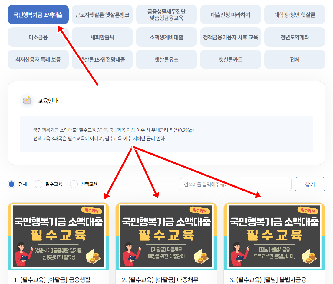 국민행복기금 소액대출을 받기 위해서는 필수교육을 반드시 들어야 합니다. 필수교육이 총 3가지 인데 이 중 1가지만 교육시청 하여도 우대금리 0.2%를 받을 수 있습니다.