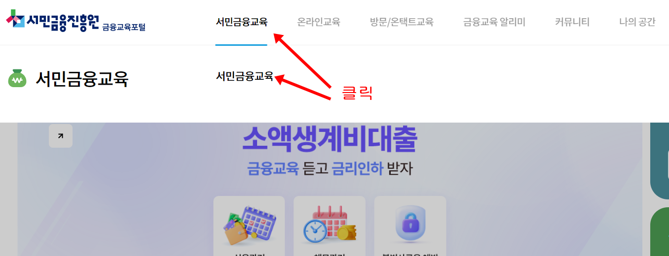 위 사이트로 이동 하셨다면 아래와 같은 메인 화면이 나올 겁니다. 일단 상단의 서민금융교육에 마우스를 대시면 아래 또 다른 카테고리가 나올텐데 거기서 서민금융교육을 클릭 해 주세요. 아래 그림처럼 따라 오세요.