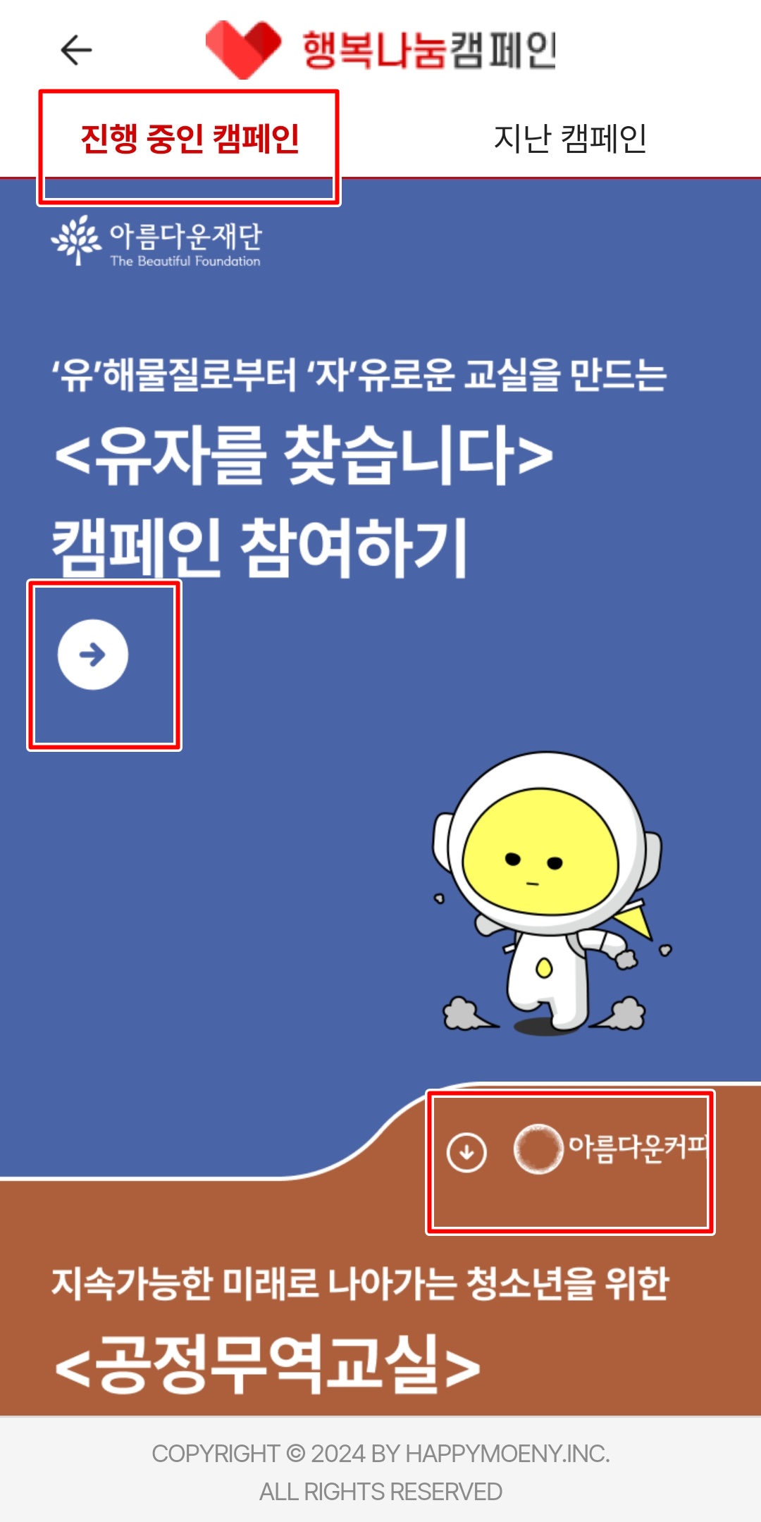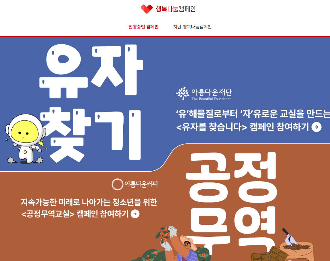 행복나눔에 들어가면 현재 행복나눔 캠페인 목록이 뜨는데요. 진행중인 캠페인에 현재는 2가지 캠페인이 있군요. 아무거나 눌러 주세요.